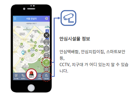 2. 23년 11월부터 '안심시설' 메뉴에서 서울 전역 2만 3천여 개 방범비상벨 위치가 확인 가능합니다.