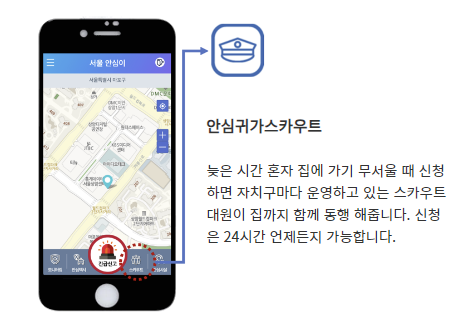 * 24시간 언제든지 가능하며, 스카우트대원이 직접 집까지 귀가 길을 동행해줍니다.