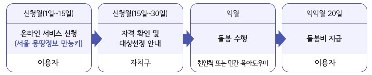 - 영아 1명 : 월 40시간 이상 돌봄 시 월 30만원 지원, 최대 13개월 지원