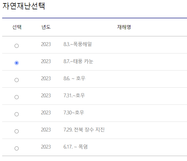 3) 해당하는 자연재해 선택 (2023년 8월 현재의 경우, 태풍 카눈 선택)