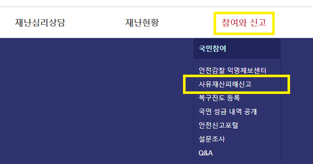 2) 오른쪽 상단 참여와 신고 탭 선택 > 사유재산피해신고 선택