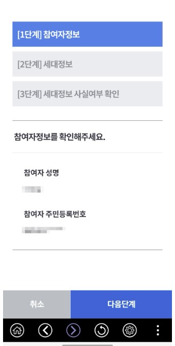 6. 참여자정보, 세대정보, 세대정보 사실여부 확인 3단계 정보를 모두 확인 후 최종 확인 버튼 클릭